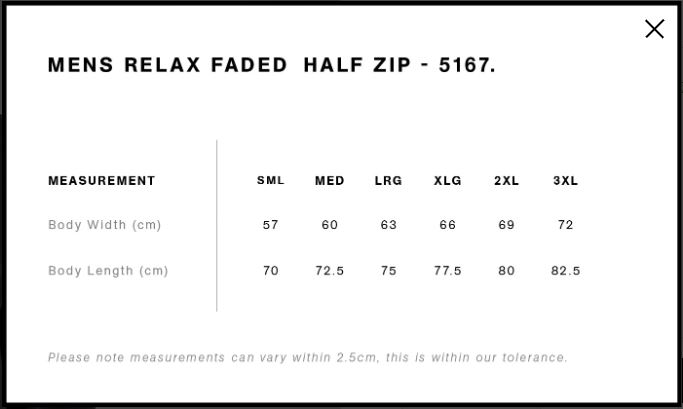 Construction - Garment dyed, mock neck, silver SBS zip at front placket, sleeve cuff & hem ribbing, CVC fleece, preshrunk to minimise shrinkage