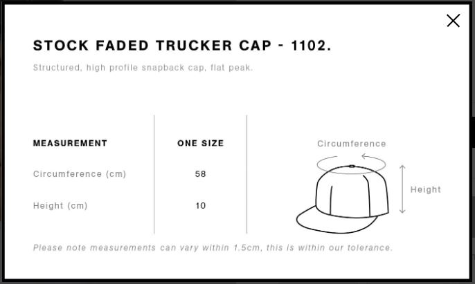 Fit: High Profile Fabric: Mid weight, 100% cotton front and peak, 100% polyester mesh back Construction: High profile - snapback cap, flat peak Washed finish front and peak with worn look, plastic snapback, tonal under-peak lining, mesh back One size fits all Tear-out AS Colour label