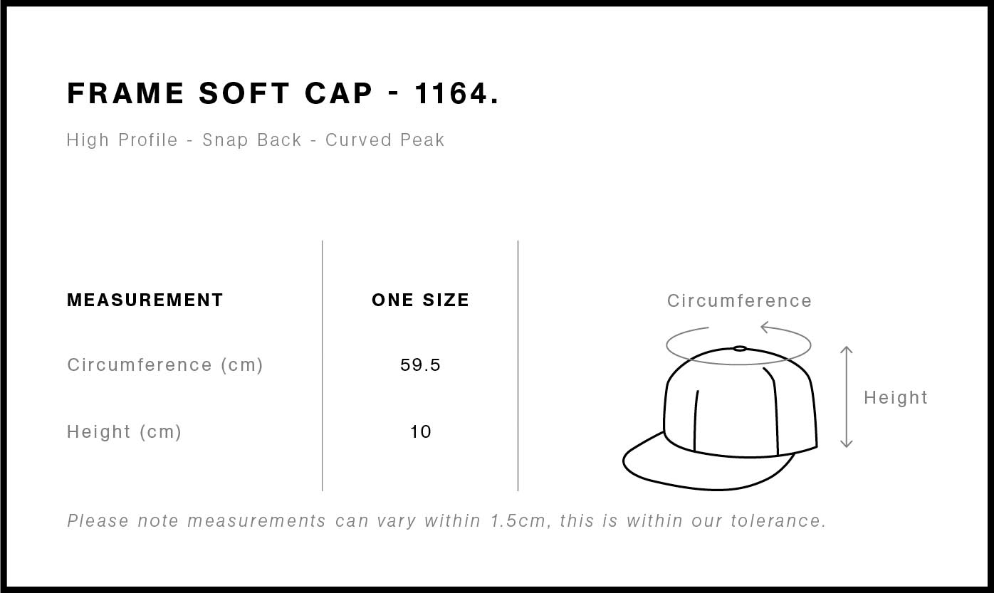 Fit: High Profile Fabric: Mid weight, 100% cotton Construction: High profile - snapback cap, curved peak Unstructured front, plastic adjustable snapback, tonal under-peak One size fits all Tear-out AS Colour label