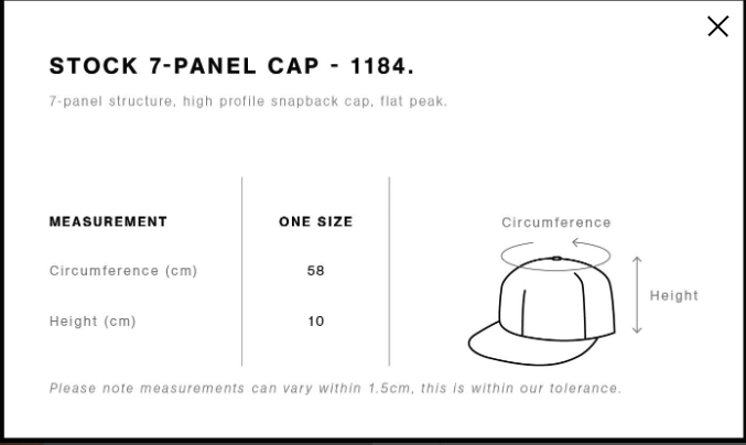 Fit: High Profile Fabric: Mid weight, 100% cotton Construction: High profile - snapback cap, flat peak Plastic snapback, tonal under-peak lining, stitching eyelets, self fabric dome at top One size fits all Tear-out AS Colour label