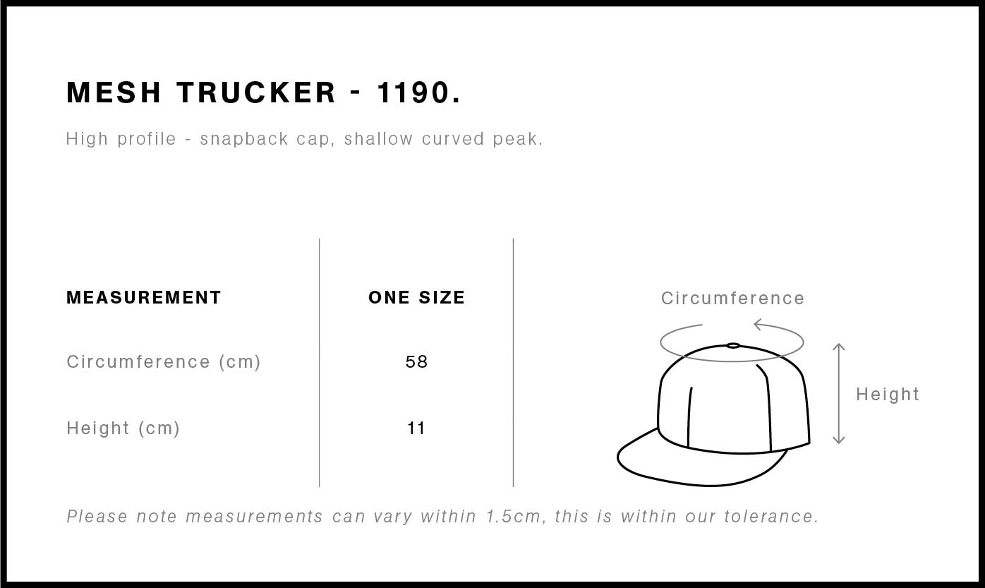 High profile - snapback cap, shallow curved peak, tonal mesh back, plastic snapback, tonal under-peak lining