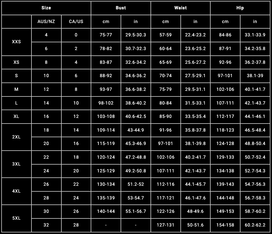 | BUST (cm) | 83-87 | 83-87 | 93-97 | 98-102 | 103-108 | 109-114 | 115-119 | 120-124 | 125-129 |